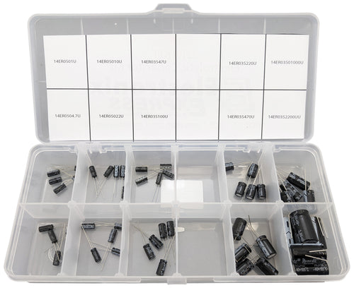 50 Piece Electrolytic Capacitor Assortment Kit with Case, 10 Different Values, 1 μF to 2,200 μF