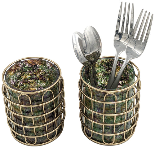 Set of 2 Elegant Stainless Steel (Gold Color) and Green Glass Cutlery Holders for Silverware - 3.1-inch Diameter x 4-inch Tall