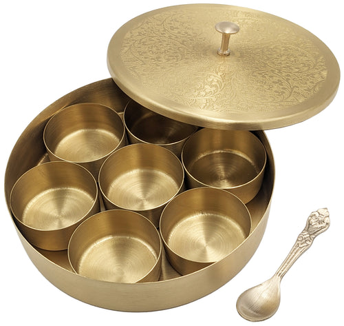 Small Size Brass (Gold Color, Floral Pattern) Round Masala Dabba Box with 7 Containers and Mini Spoon, Measures 6⅕-inches Wide x 1⅜-inches Tall