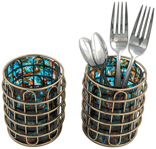 Set of 2 Elegant Stainless Steel (Gold Color) and Turquoise Glass Cutlery Holders for Silverware - 3.1-inch Diameter x 4-inch Tall