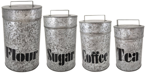 Set of 4 Galvanized Metal Kitchen Storage Canisters with Lids - Includes a Container for Flour, Sugar, Coffee, & Tea - Rustic Country Farmhouse Theme