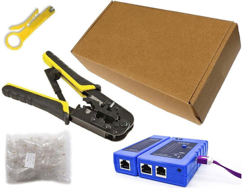 Network Cable Tool Set with Cable Crimp Tool, Wire Stripper, LAN RJ45 and RJ11 Tester and 100 Cat5e Plugs