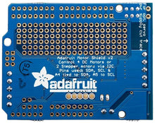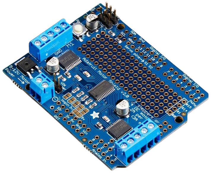 - Instead of using a latch and the Arduino's PWM pins, we have a fully-dedicated PWM driver chip onboard. This chip handles all the motor and speed controls over I2C. Only two data pins (SDA & SCL in addition to the power pins GND & 5V) are required to drive the multiple motors, and since it's I2C you can also connect any other I2C devices or shields to the same pins. This also makes it drop-in compatible with any Arduino, such as the Uno, Due, Leonardo and Mega R3.