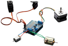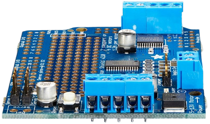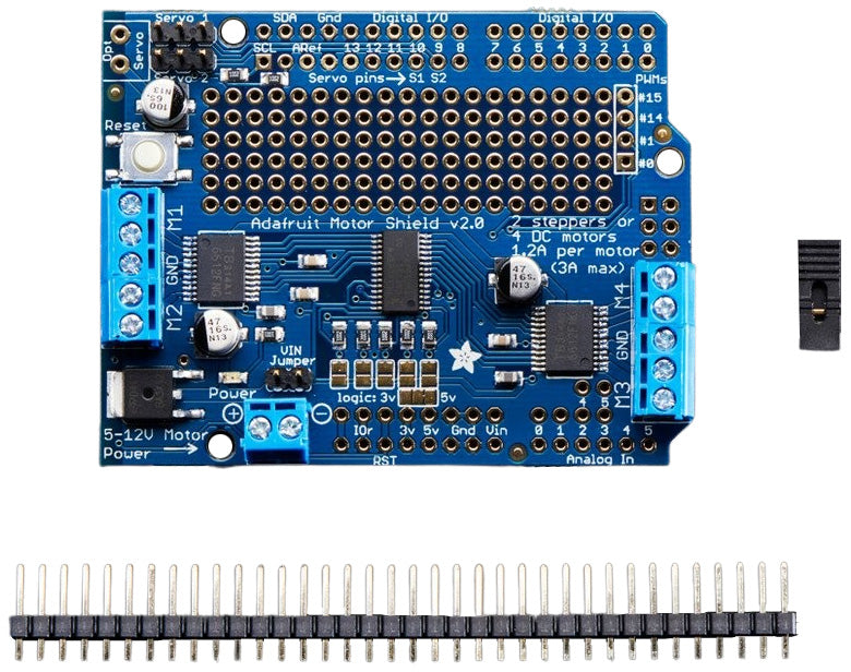 Comes with an assembled & tested shield, terminal block, plain header, jumper. Some soldering is required to assemble the headers on. Stacking headers not included, but we sell them in the shop so if you want to stack shields, please pick them up at the same time. Arduino and motors are not included but we have lots of motors in the shop and all our hobby servos, DC motors, and stepper motors work great.