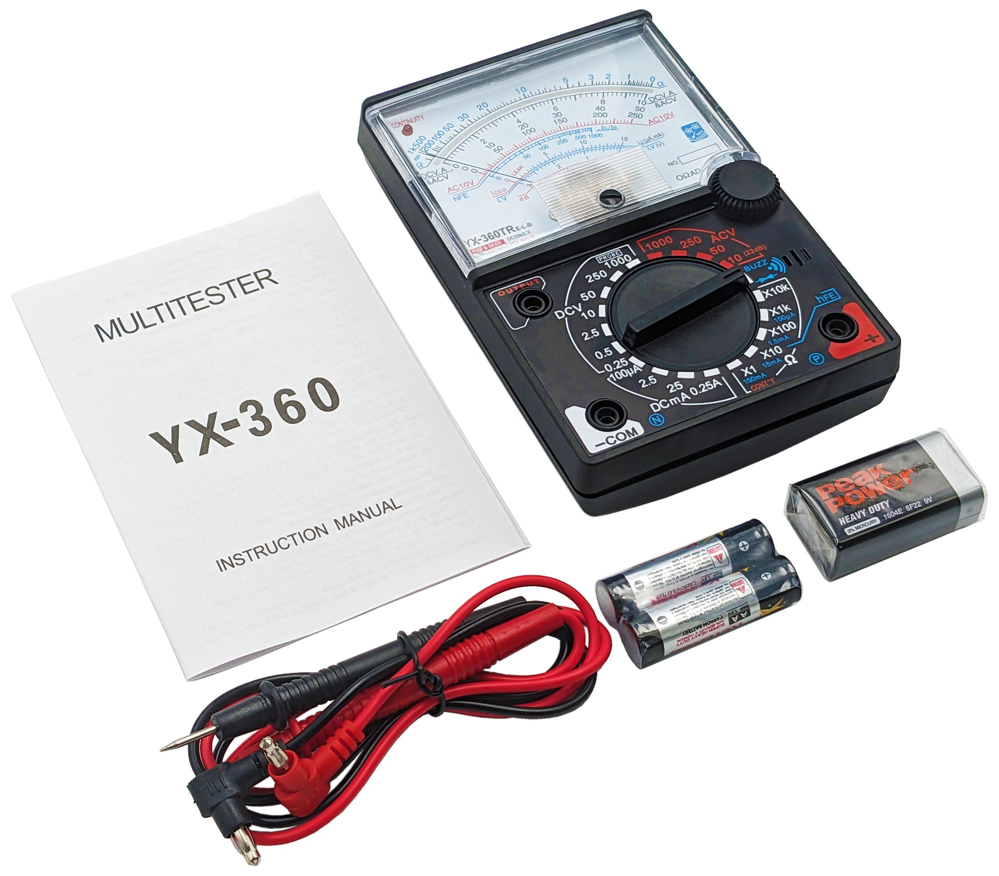 - Includes: Analog multimeter, test leads, user manual, 9V battery, and two AA batteries. Note: Requires a Phillips screwdriver to insert or replace batteries.