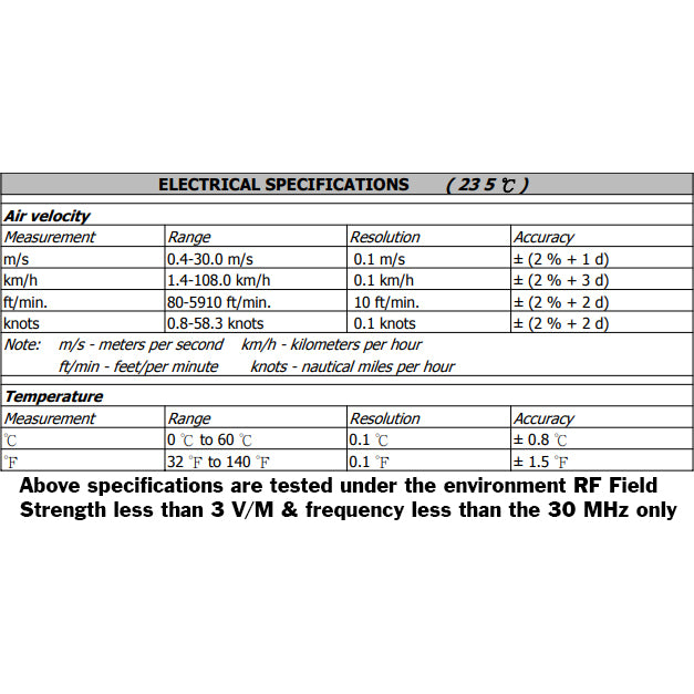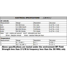 - Measures wind speed in m/s, km/hr, ft/min, knots and temperature in °C and °F