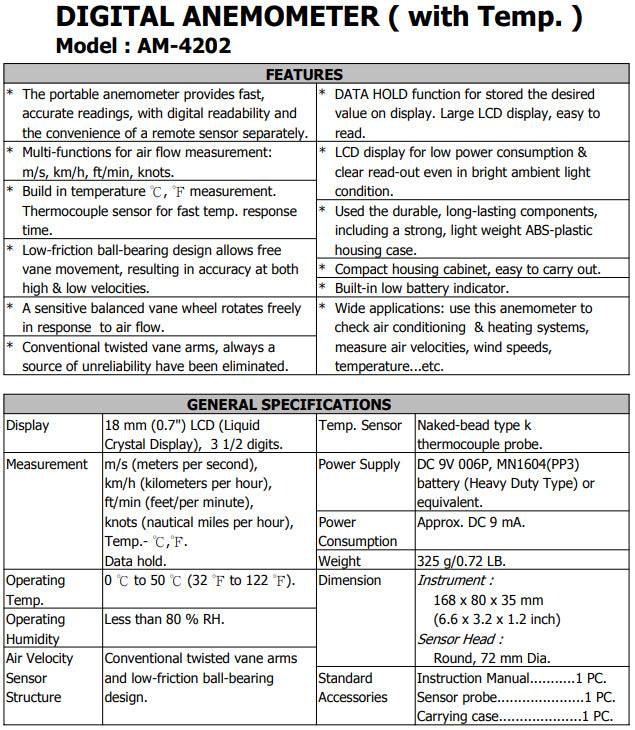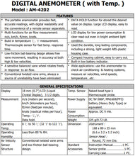 - Suitable for many applications including air conditioning & heating systems, measuring air velocities, wind speeds, temperature, etc.