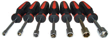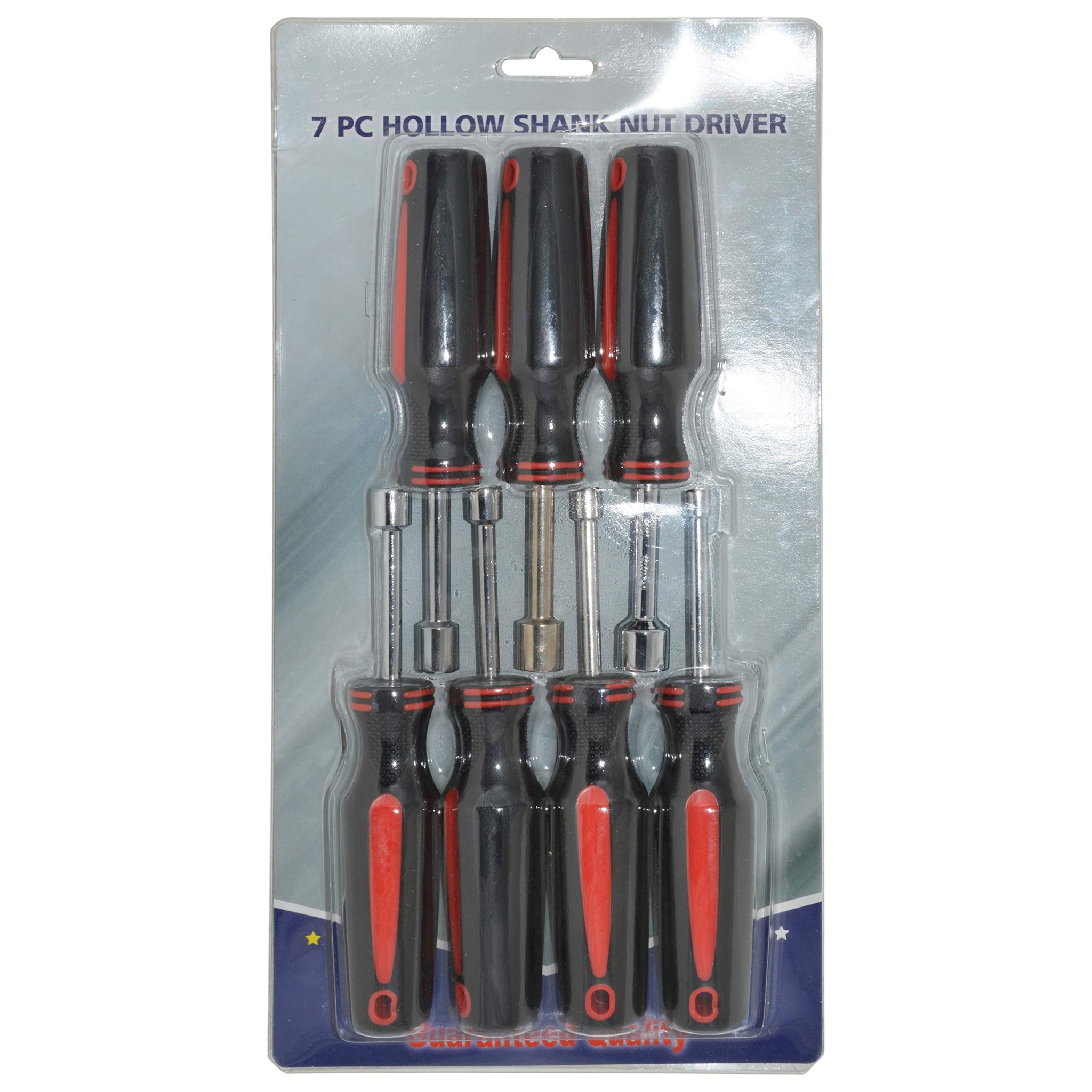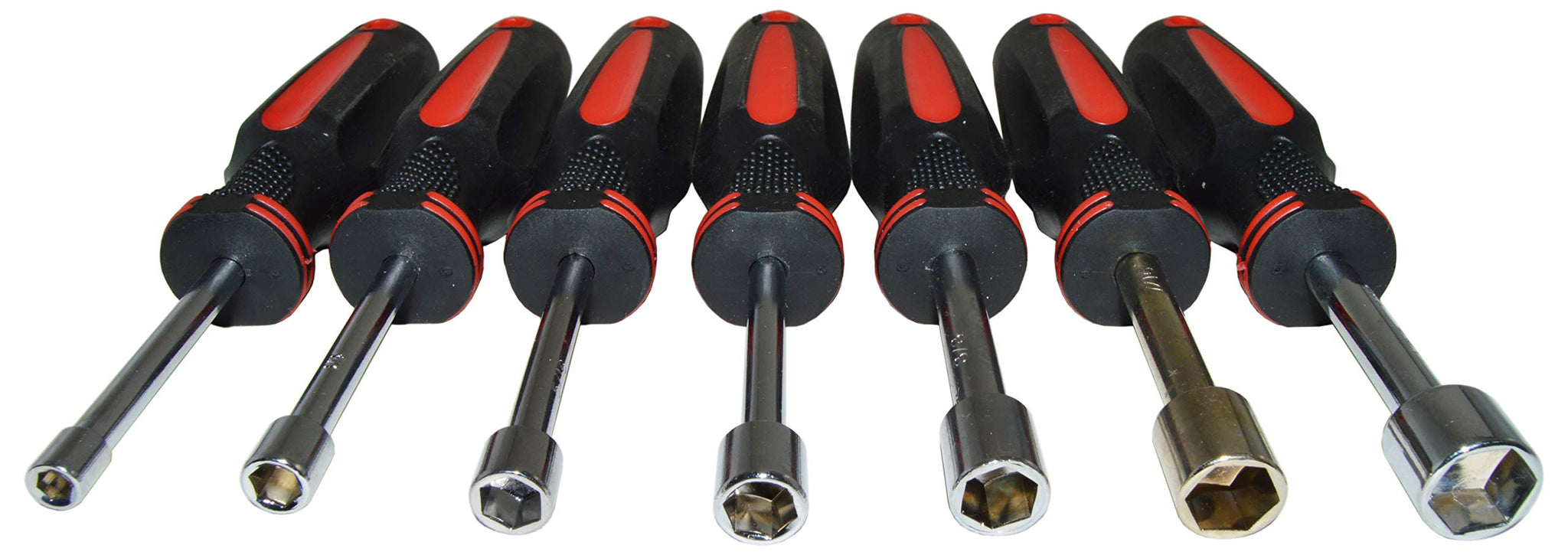 These drivers measure 7 inches long overall and feature ergonomic rubberized handles that are designed to offer comfort and improve grip. The sockets are chrome plated hardened steel, and the shaft is engraved with the socket size for easy identification. Each driver features a loop in the handle for easy hanging above your work bench.