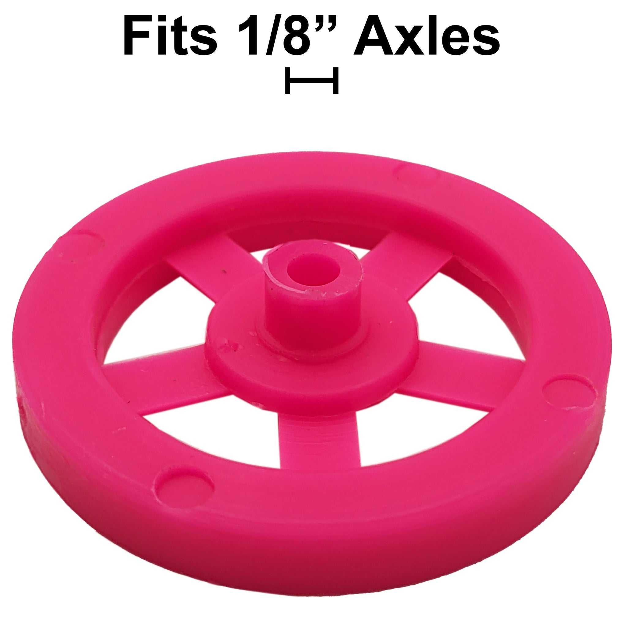 - Each wheel is made of durable polypropylene, constructed in one piece, and features an axle hole that fits a 1/8" diameter axle (axle not included). Note: The axle hole is only on the inside (doesn't go all the way through the wheel).