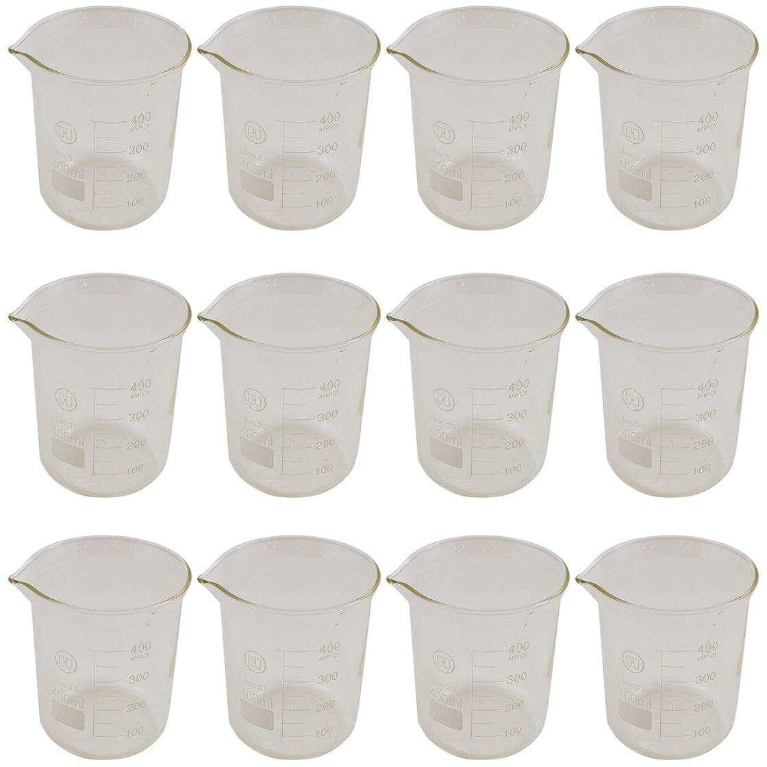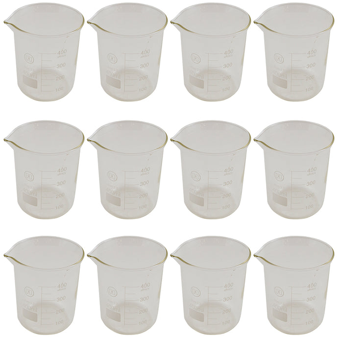 These 400mL low form graduated glass beakers measure 112mm tall and 83mm wide. The beakers are graduated from 100 to 400 mL for containment and dispensing measurements. Each weighs 5.2 ounces. Glass type: 3.3 Boro.