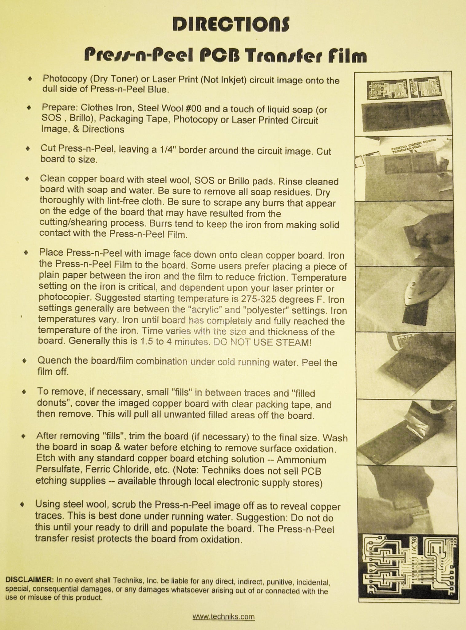 20 sheets of Printed Circuit Board transfer film for high precision, professional layouts. Adds extra layer of resist for super fine lines (less than 5 mil) and solid ground planes on single and double sided copper clad. Works with plain paper copiers and laser printers (Note: Not for use with inkjet printers). Eliminates darkrooms, chemicals, negatives and copy cameras. Make PC Boards from CAD software or magazines. 4 easy steps: Print, Iron-on, Peel off, and Etch. Detailed instructions are included.