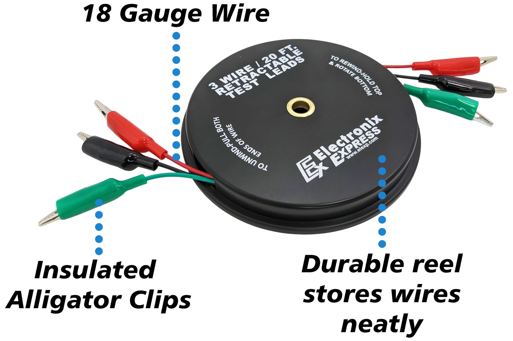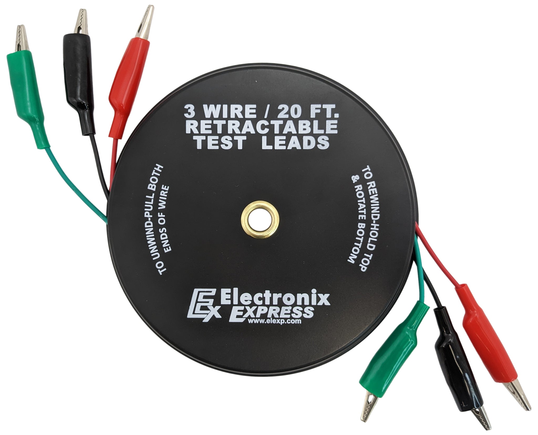- 3 wire red, black, and green retractable Test Lead cables, each 20 feet in length