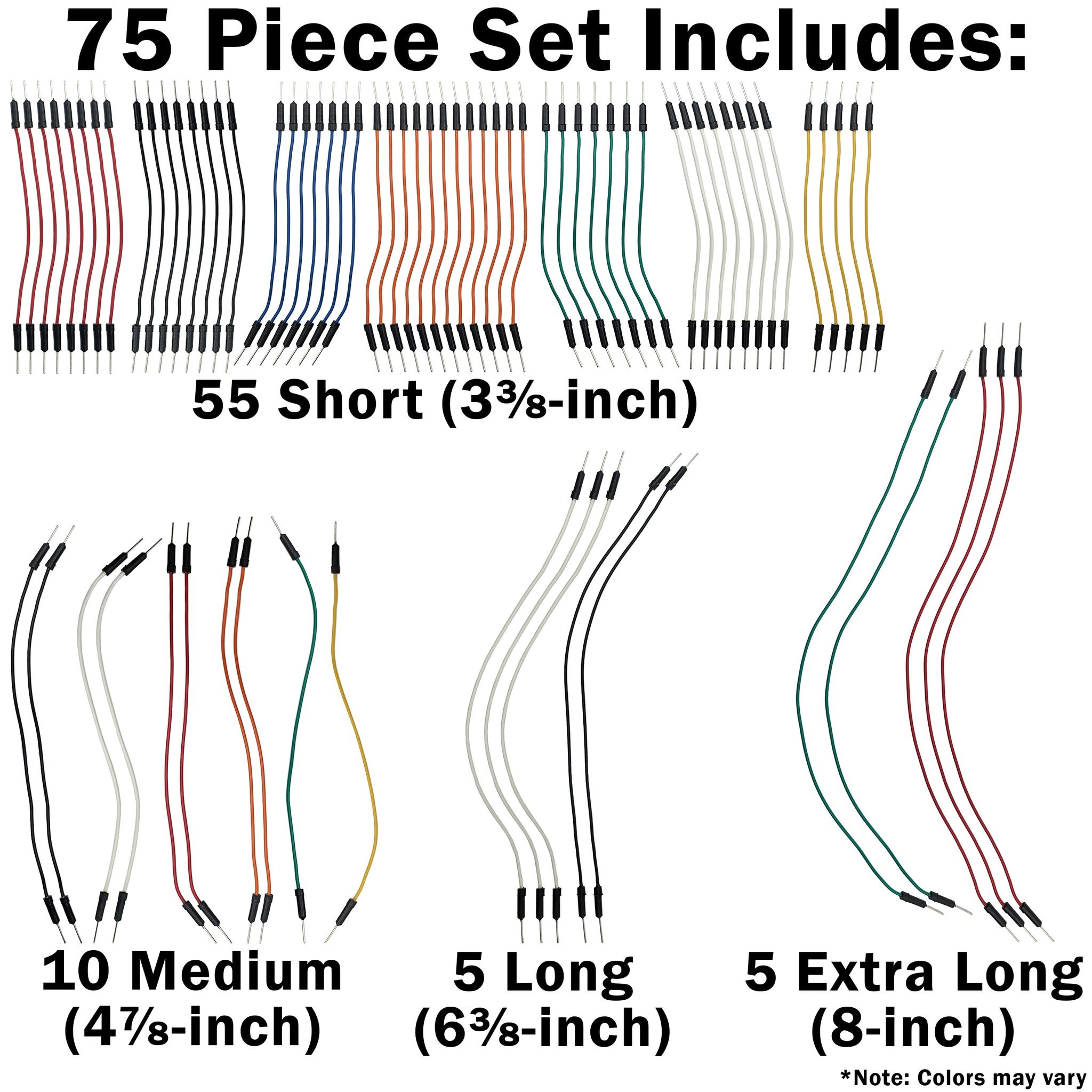 - 75 flexible breadboard jumper wires in assorted colors and lengths