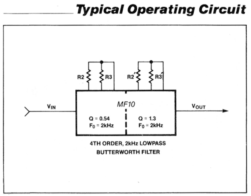 The MF10 is a dual 2nd order, switched capacitor, state variable filter. Each of the two filter sections uses two switched capacitor integrators and an op amp to generate a second order function. The location of the poles (and thus the center frequency and Q) is determined by the frequency of an external clock and 2 to 4 external resistors. No external capacitors are used.