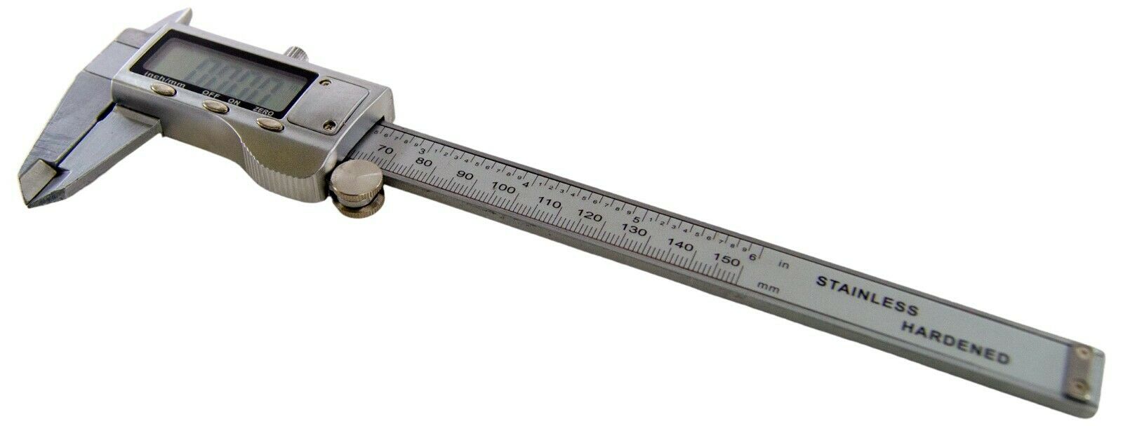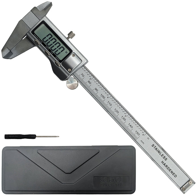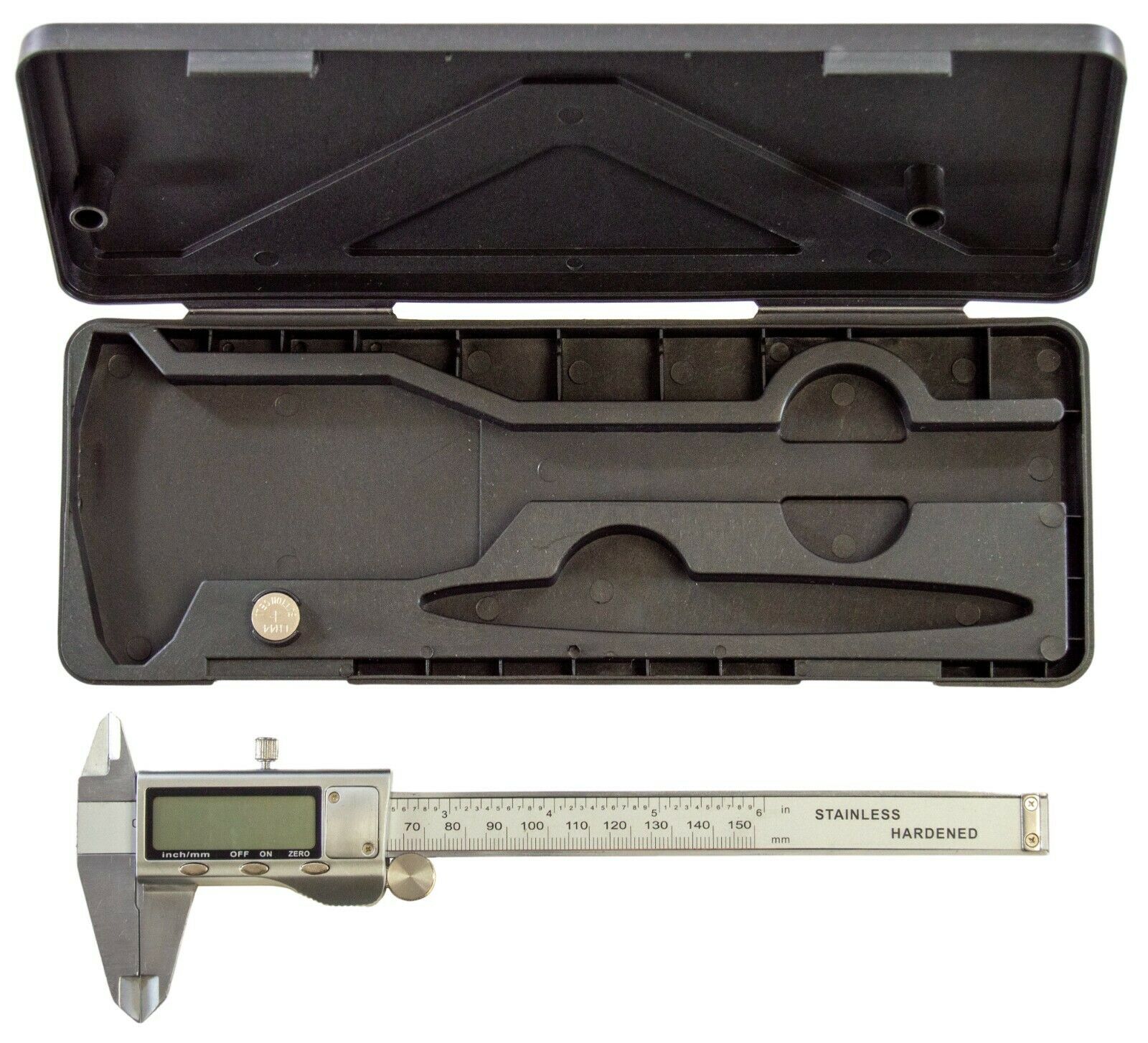 This Stainless Steel Electronic Digital Caliper offers instant and precise measurements of internal, external, length, and depth of any object. It measures up to 6 Inches / 150 Millimeters and has a conversion feature allowing you to convert measurements to inches or millimeters with the simple press of a button. The caliper features a durable stainless steel construction, easy-to-read LCD display, zero calibration button, and automatic On/Off. It's adjustable thumbscrew provides tension for optimal movement of the slide and locks the jaws of the caliper in place. Includes a hard plastic storage case and instruction manual.