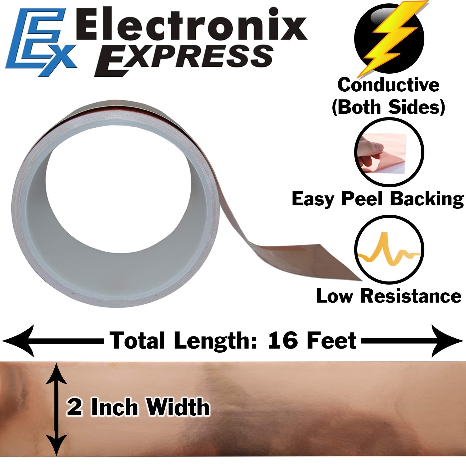 16 feet of 2 inch wide highly conductive copper tape on a plastic spool for easy dispensing and storage. With it's ability to conform to all surfaces and shapes, this copper tape is suitable for EMI shielding, grounding, paper circuits, electrical repairs, decorations, stained glass, arts & crafts and more! Features an easy to peel waxed paper backing and you can bend, wrap, twist, tear and layer the tape with ease! The spool is made of plastic and has a 3 Inch inner diameter. Warning: As the tape is made of real copper foil, the edges can be sharp. Please be careful when handling.