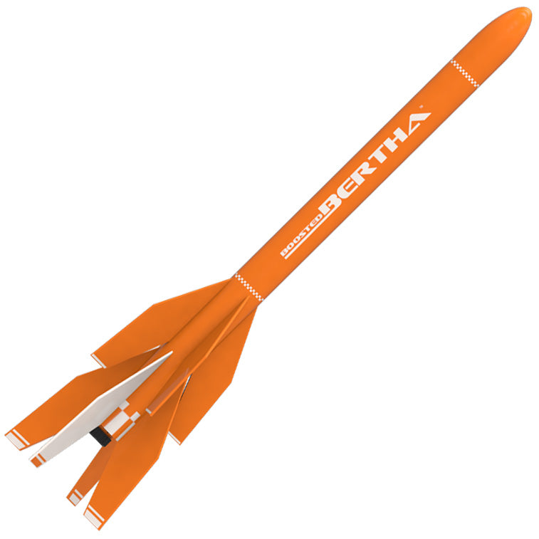 Estes is proud to welcome the newest member of the Bertha family, the Boosted Bertha. This beaut rounds out the collection by being the first in the series to feature a two-stage rocket booster. A sport rocket at its core, the second booster of this multistage flying model rocket will push this Bertha skyward, reaching twice the height of Big Bertha. The Boosted Bertha will reach altitudes of 1000 feet when powered with an Estes C6-0 engine in the booster stage and an Estes C6-5 engine in the main rocket. After the first stage ignites, the booster jettisons and gently tumbles back to earth. Once the rocket reaches apogee, the rocket will deploy the recovery system-a colorful 18 inch parachute. This provides the Boosted Bertha a light landing so that it can be quickly prepared for another launch. Quality Estes body tubes, laser cut wood fins, a molded plastic nose cone, and easy-to-apply waterslide decals make for a full day of building enjoyment. Once painted to perfection, this Bertha is a must-have for any rocket collector!
