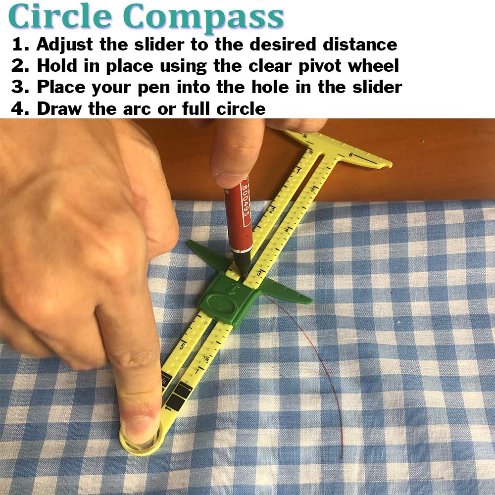 - Circle Compass - Adjust the slider to the desired distance, then hold in place using the clear pivot wheel. Place your pen into the hole in the slider then draw the arc or full circle