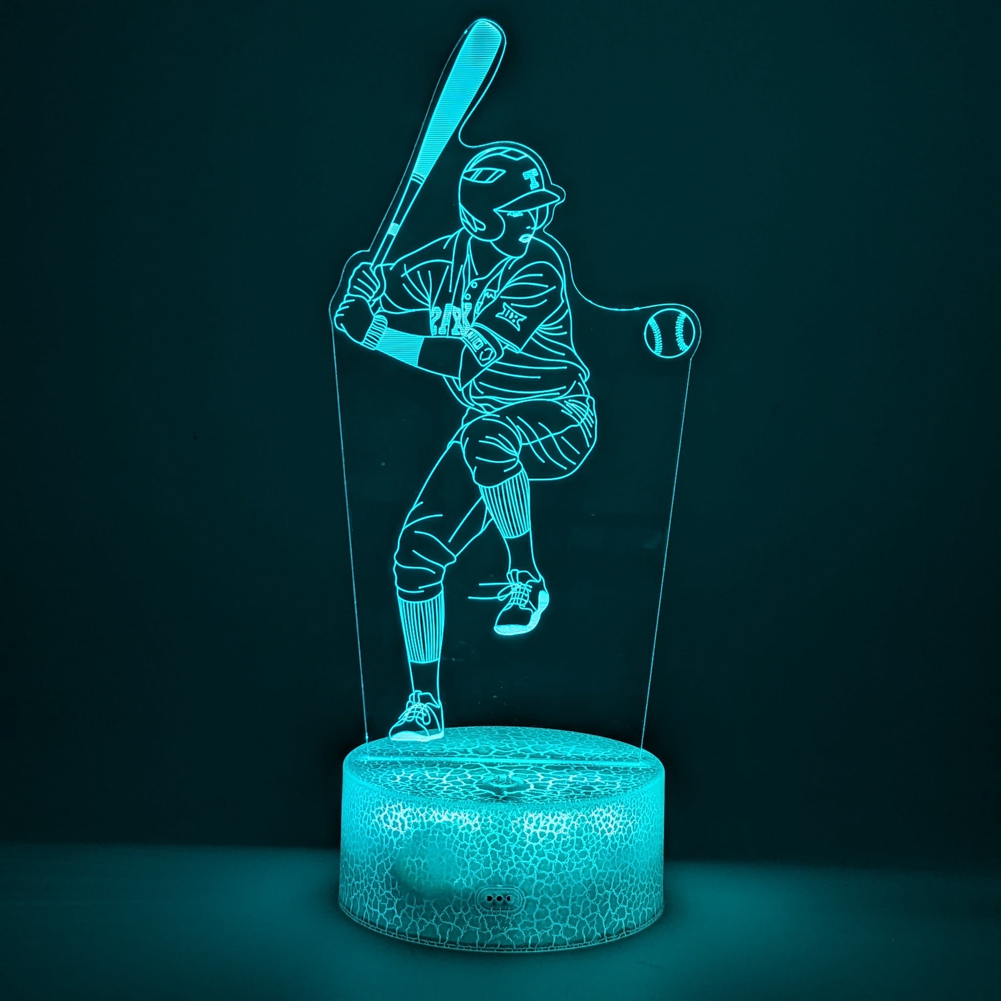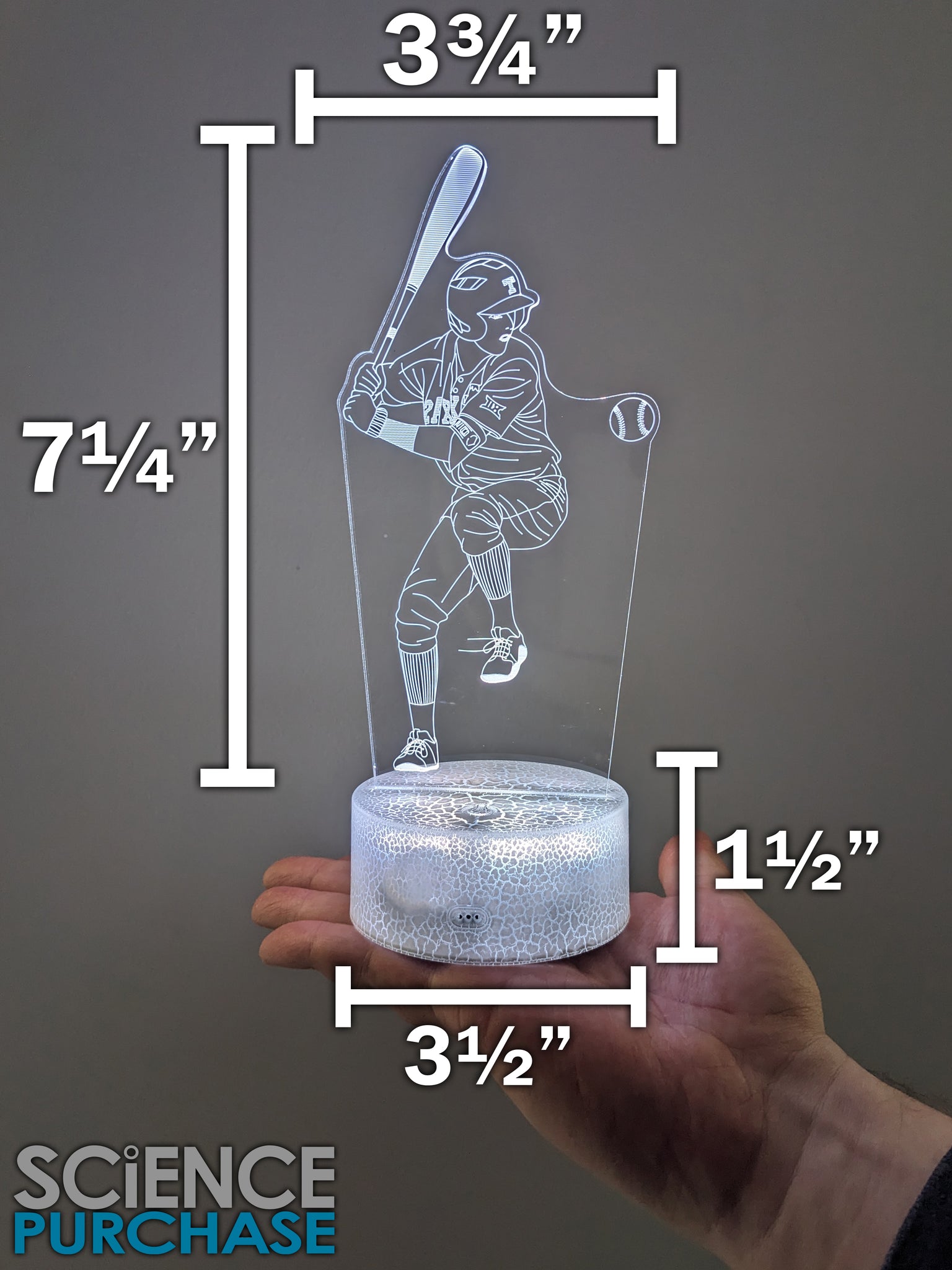- The night light features energy efficient LED lights that illuminate both the base as well as the Baseball Windup design, creating an illusion that the illuminated design is "floating" above the base. The acrylic plate measures about 7¼-inches tall, 3¾-inches wide, and 0.14-inch thick. The base has a 3½-inch diameter and is about 1½-inches tall.