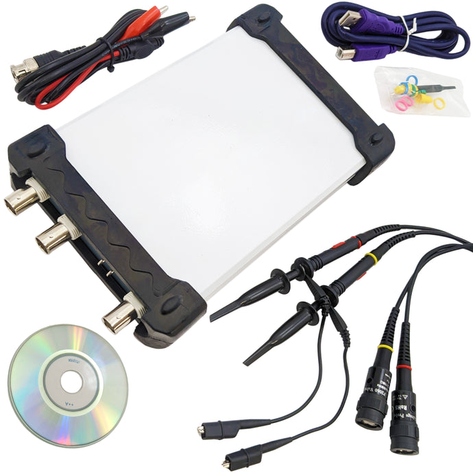 The oscilloscope is a portable size, lightweight, and easy to carry. It uses standard BNC connectors for use with the two included 1X/10X probes. The included USB cable is both for data and power. A digital copy of the user manual and the Multi VirAnalyzer software for Windows is included on the mini CD (also available online). Once connected your computer, the signal can be viewed on your monitor for clear measurement. The software provides an intuitive interface for operation of the oscilloscope panel.