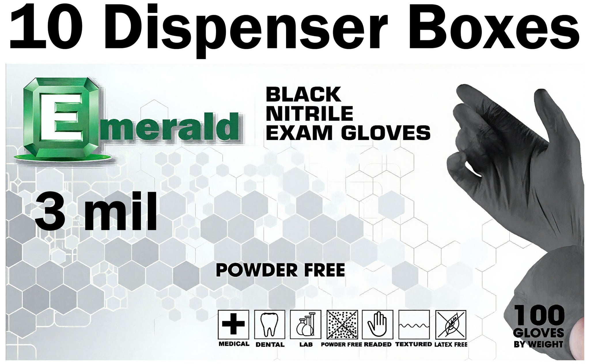 1,000 gloves total (includes 10 dispenser boxes, 100 gloves per box). Size: Large. Emerald Black Nitrile Powder-Free Exam gloves provide outstanding comfort at an affordable price. These latex-free, powder-free textured gloves are best for tactile sensitivity, making them ideal for tattoo artists. The gloves feature a beaded cuff for easy donning, and their black color conceals surface agents, allowing for longer use. They guard against hand fatigue and have superior tensile strength, in addition to being chemical-resistant and unrivaled against blood-borne pathogens and other body fluids.