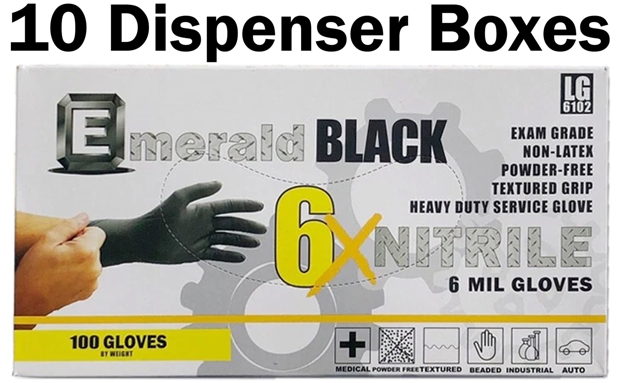 1,000 Nitrile gloves total (includes 10 dispenser boxes, 100 gloves per box). Size: Large. These heavy duty 6 Mil nitrile gloves are perfect for tough jobs. Their sleek black color make them the preferred nitrile glove for everything from automotive to tattoo use. Non-latex formula features powder-free finish and exam grade level protection.