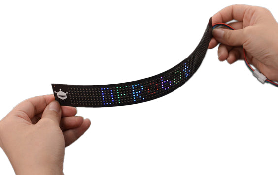 This flexible RGB LED matrix display supports showing both numbers and alphabets.