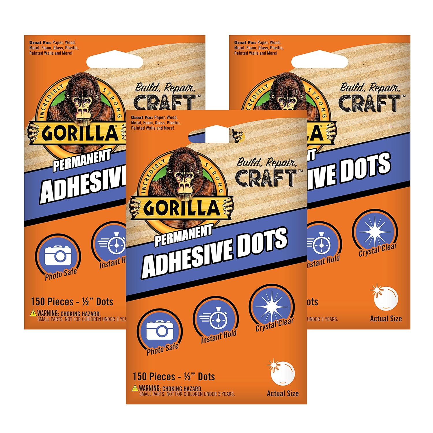 Gorilla® Permanent Adhesive Dots are crystal clear with adhesive on both sides making them ideal for card making, scrapbooking, attaching photos, and embellishments. These no mess dots are a permanent alternative to glue and are photo safe and acid free. Great for home, school and office. Use on photos, paper, wood, metal, foam, glass, plastic, painted walls, and more!