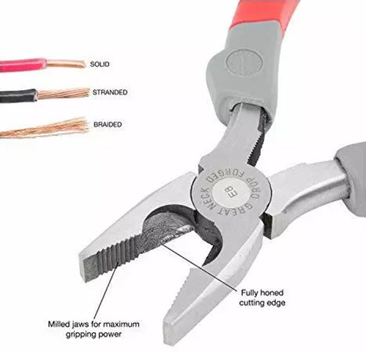 The GreatNeck® E8C 8 Inch Linesman Pliers are designed for gripping, twisting, bending and cutting wire and cable. These pliers are constructed with drop forged steel for strength, and feature a built-in wire cutter with fully-honed edges.