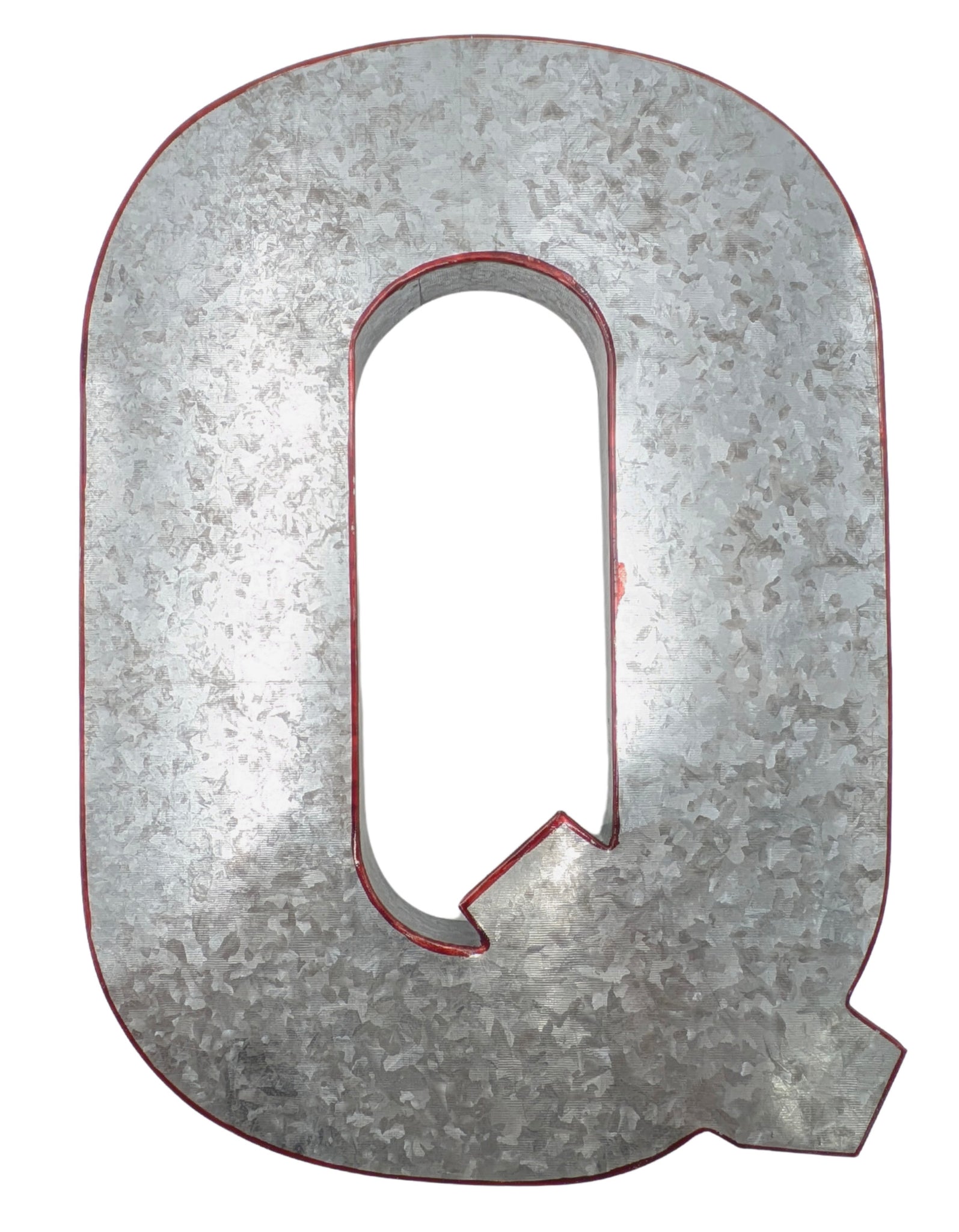 Huge 20" Metal Letter Q Wall Décor, Silver with Red Border Edges, Galvanized Wall Mountable Decoration for Country, Mid-Century, or Farmhouse Theme