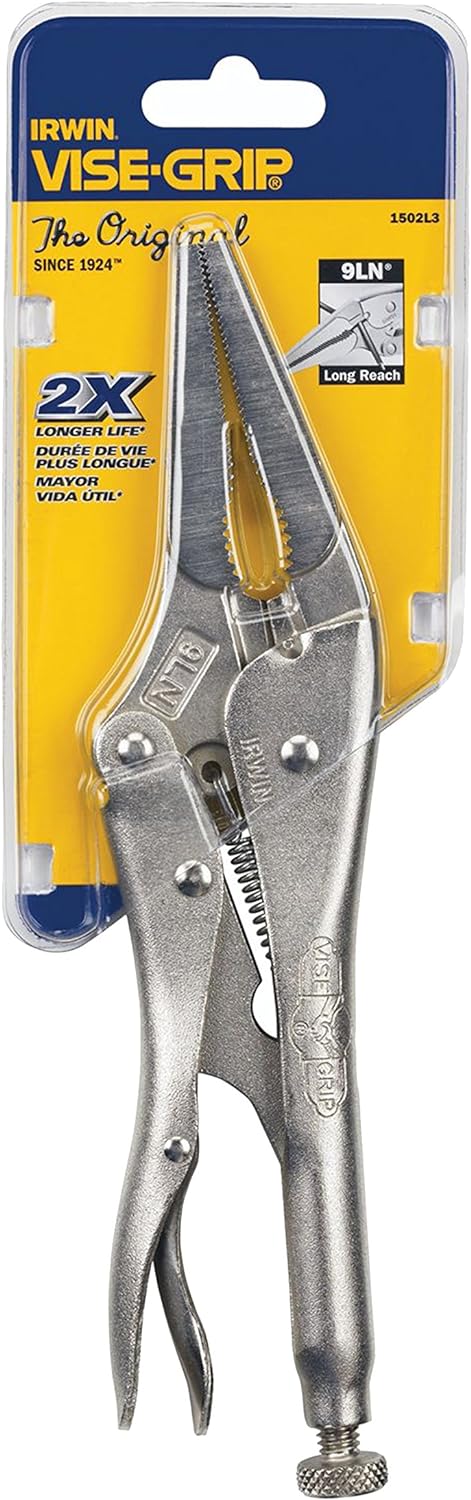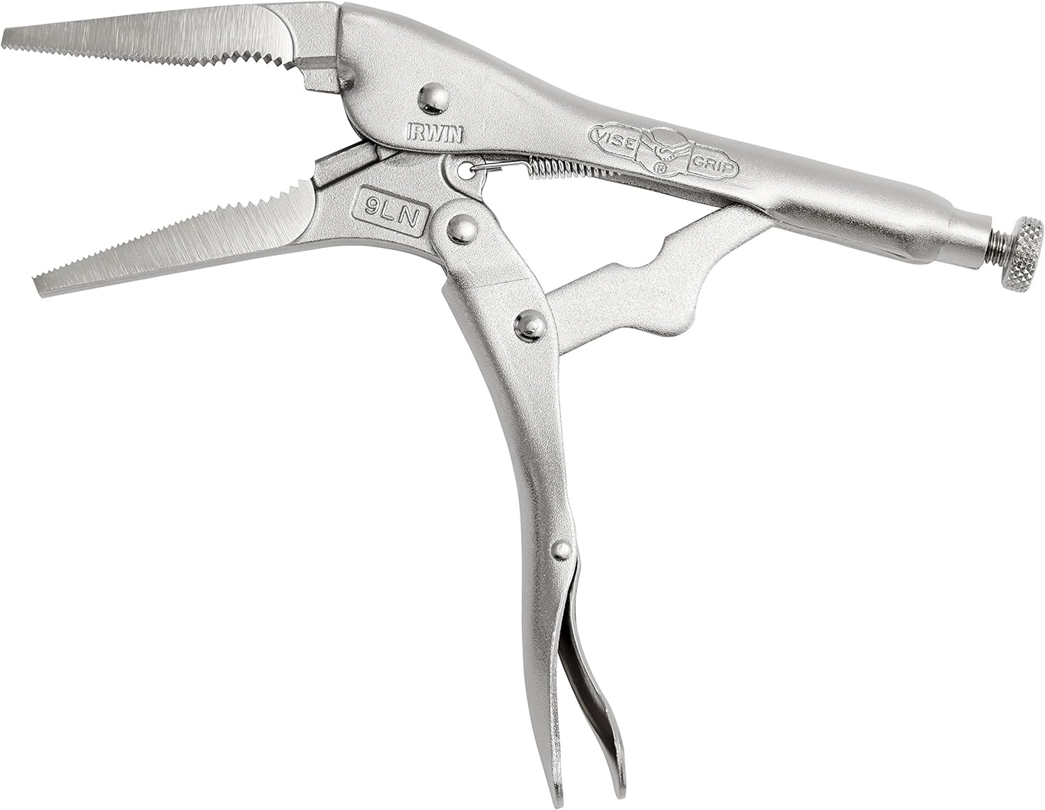 Irwin industrial long nose locking pliers are made with a high grade, heat treated alloy steel construction delivering maximum toughness and superior durability. Features hardened teeth that grip from any angle making it ideal for many applications. Contains wire cutter for added convenience and long, straight nose providing easy access in narrow, hard-to-reach places. Simply turn screw to adjust pressure and fit work, staying adjusted for repetitive use.