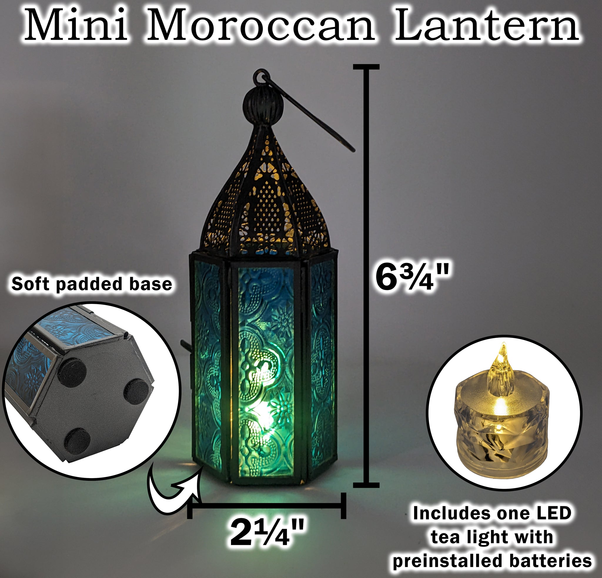 - Mini Moroccan Lantern - Open the front compartment using the latch, then place the included flameless (battery powered) LED light inside. The light shines through the lantern's blue walls for a beautiful effect. You can either hang the lantern using hook at the top, or place it on any flat surface (soft pads are on the bottom to protect the surface it is placed on). Measures 2¼" wide and 6¾" tall (not including the hook).