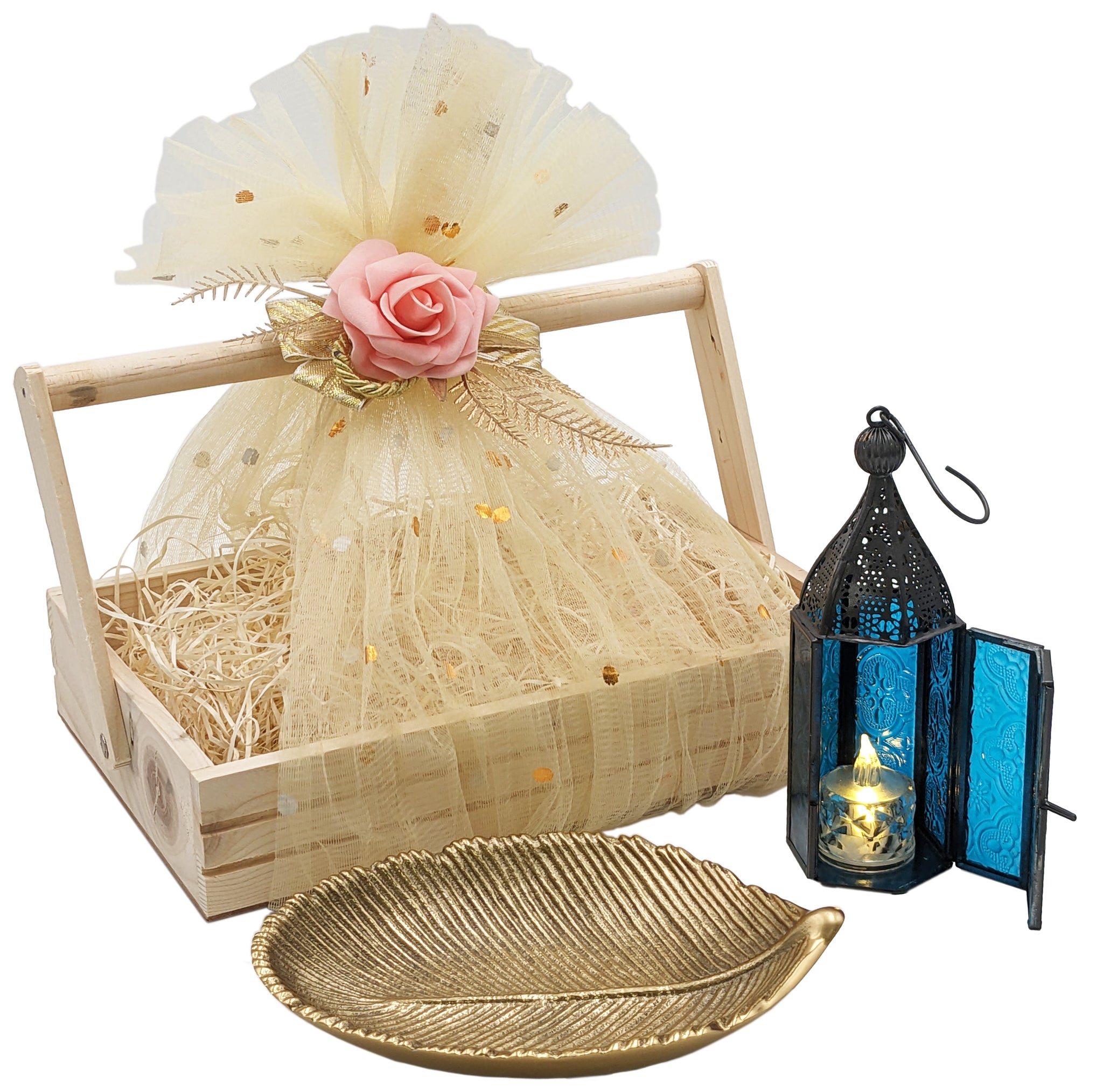 - Leaves of Blue Light Gift Basket - includes a gold color metal Leaf Jewelry Tray, a Mini Moroccan Lantern with LED Tea Light, and a 11¾" x 7¾" Wooden Basket complete with mesh veil, nesting material, and a pink and gold rose bow.