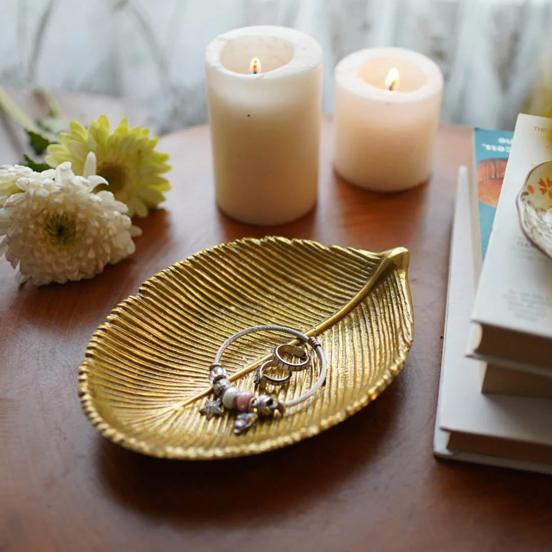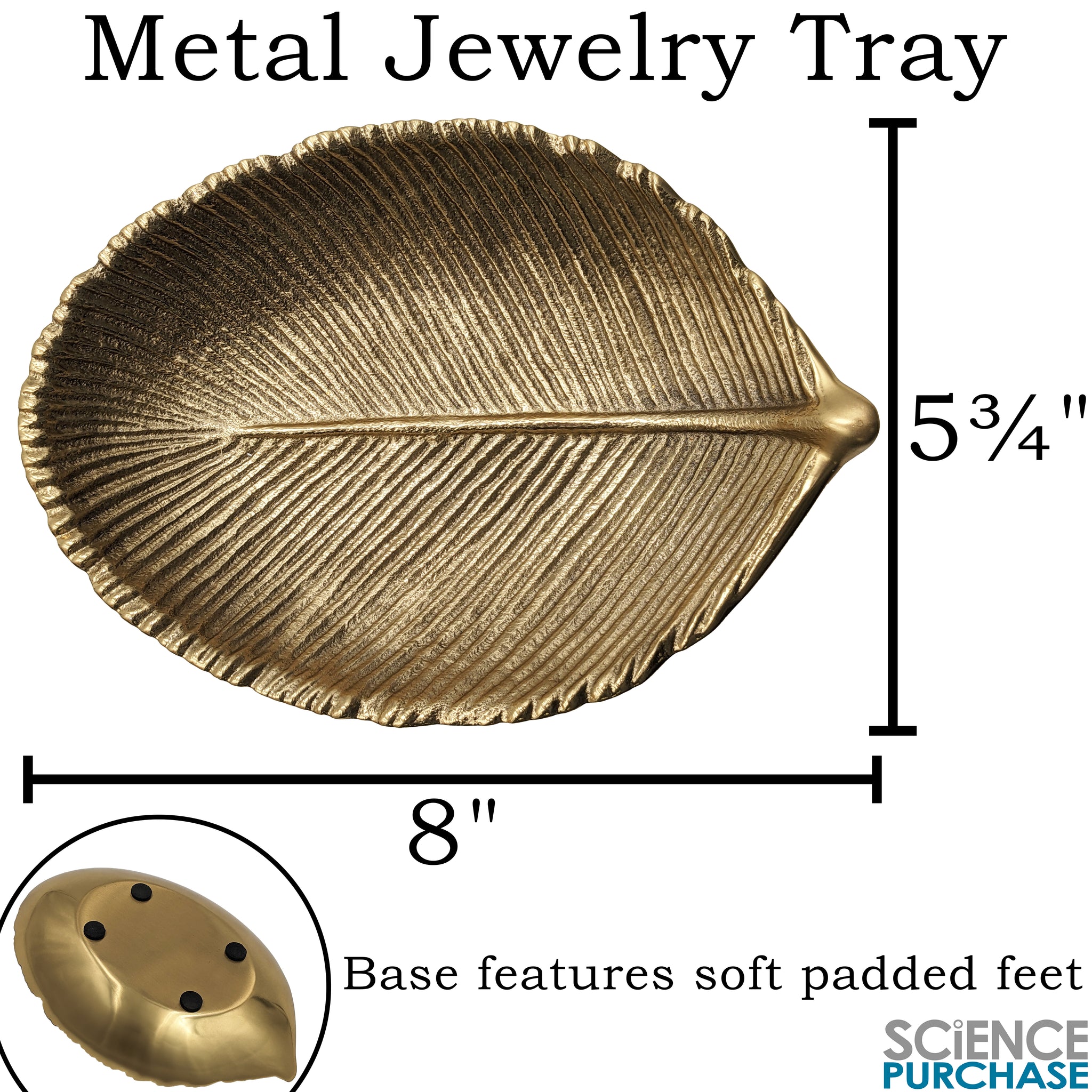 - Gold Leaf Jewelry Tray - Perfect for storing jewelry, keys, or other small items. Features a solid metal construction and the bottom has soft pads that prevent it from scratching surfaces. Measures about 8" x 5¾" x 1¼" and weighs 10 ounces.