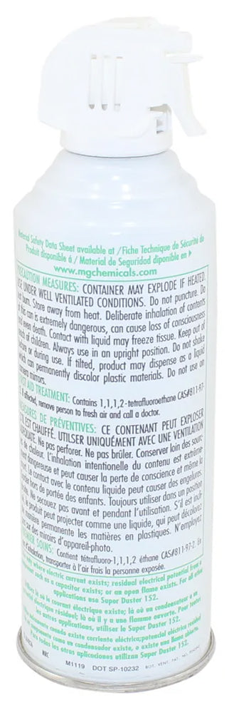 402A Super Duster 134 is a pure, non-flammable electronics duster that can be used on live electronics and electrical equipment. This electronics duster spray contains pure 1,1,1,2-tetrafluoroethane (HFC 134a), which delivers a constant, high-pressure cleaning jet. The gas jet is dry, low-residue, and chemically inert, which makes it safe for cleaning electrical and electronic components.