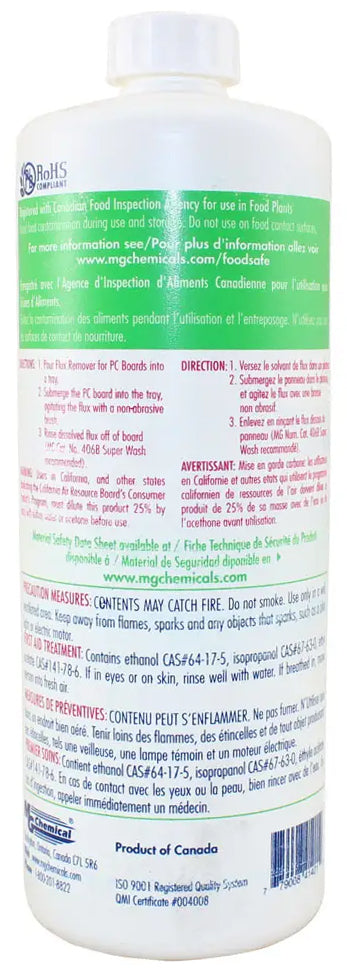 4140A is a flux cleaner that cleans post-solder residues quickly and conveniently. Its plastics-safe formula removes rosin, non-rosin and no-clean fluxes, as well as both ionic and non-ionic residues.