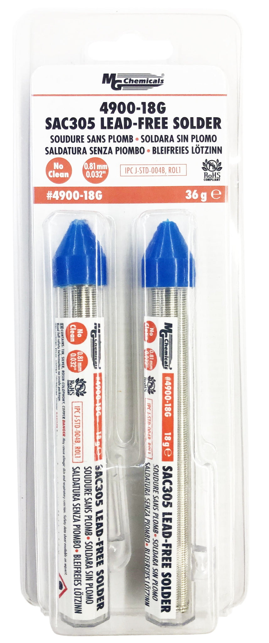 4900 SAC305 No-Clean Solder Wire is electronics grade solder wire. This lead-free solder uses the predominant lead-free alloy composition, exceeds J-STD-006C and meets ASTM B 32 purity specifications. It is complemented with a no-clean, synthetically refined, spatter-proof resin flux core that is classified as REL0 according to J-STD-004B. This solder is a great alternative to leaded solders.