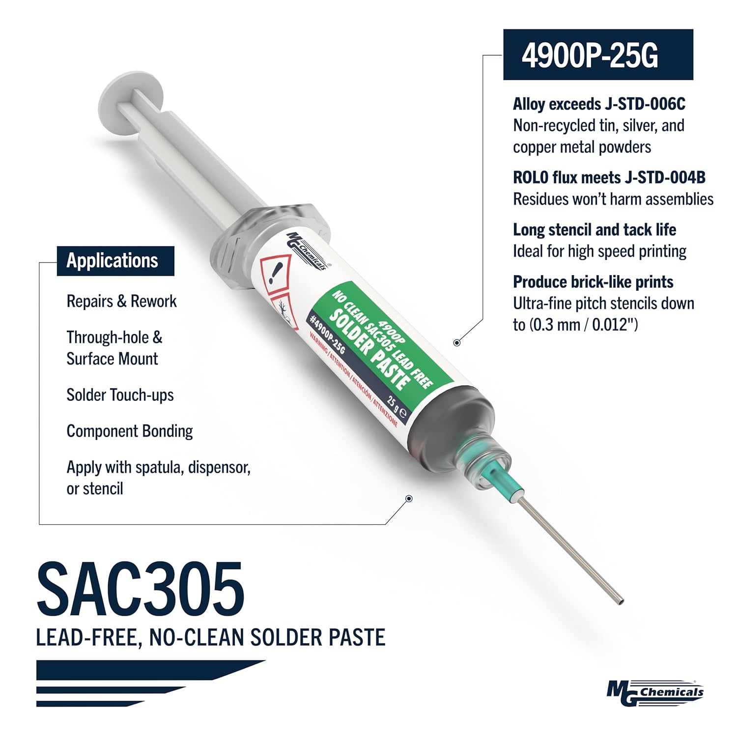 4900P SAC305 Solder Paste is a no-clean solder paste made from a blend of high-purity, non-recycled tin, silver and copper metal powder mixed with a no-clean flux. This halogen-free and lead-free solder paste is designed for extreme flux activity and the enhanced printing requirements of ultra-fine pitch applications. It provides excellent wetting on copper OSP-coatings. Wide reflow process windows combined with high thermal stability yield solder joints with smooth surfaces.
