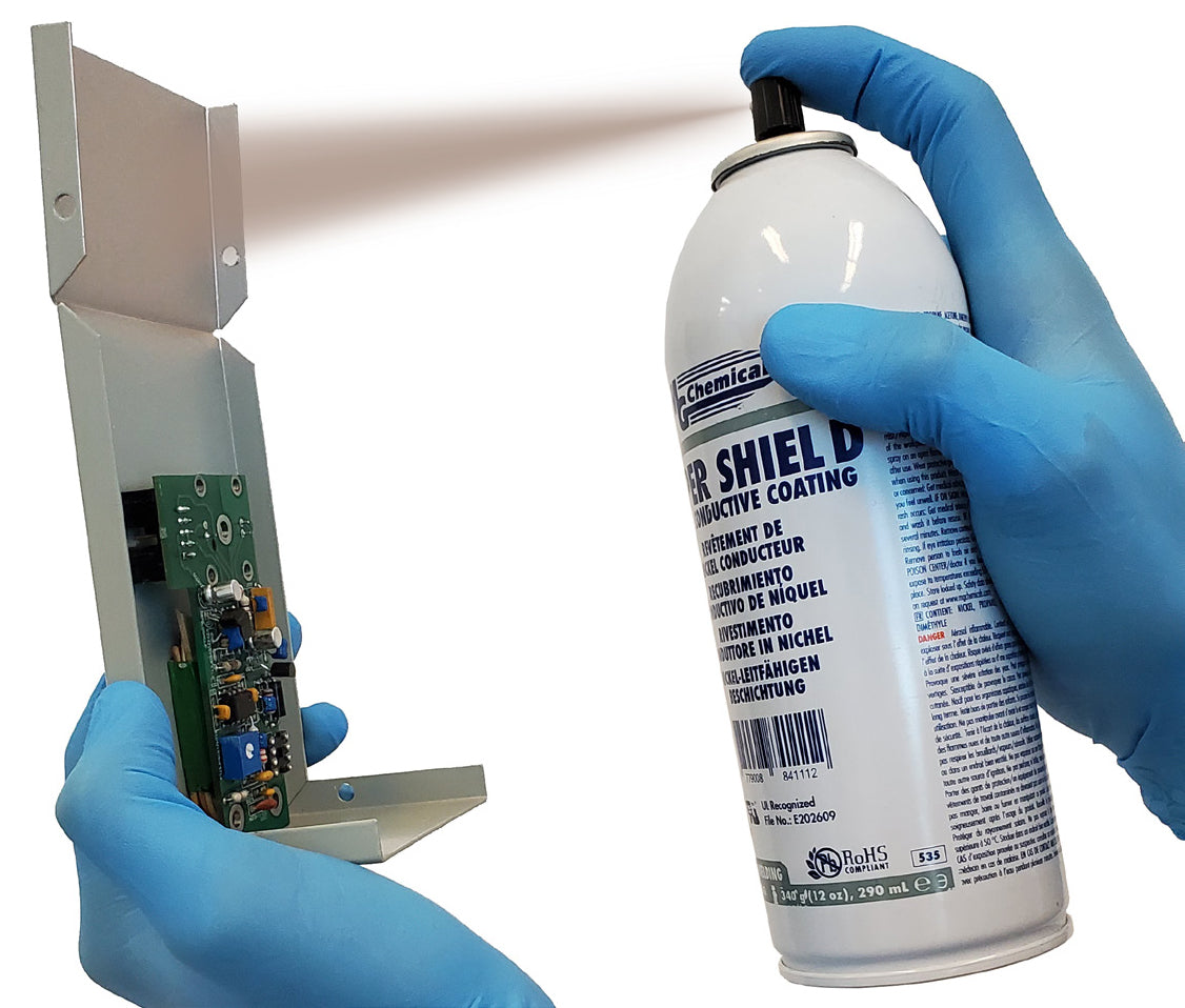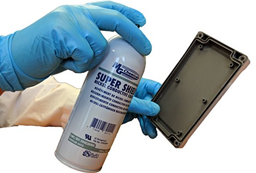 Shielding paint for plastic enclosures in convenient aerosol spray packaging. It is a solvent based acrylic lacquer, pigmented with a highly conductive nickel flake. Unlike diamagnetic fillers such as carbon, copper, or silver that only shield the electric component of electromagnetic waves, nickel is ferromagnetic and shields the magnetic component as well. It has a quick dry time, with no heat cure necessary. The cured coating is smooth, hard, and abrasion resistant. It adheres strongly to most injection molded plastics, such as ABS, PVC, nylon and polycarbonate. It also provides strong corrosion resistance and is suitable for use in marine environments.