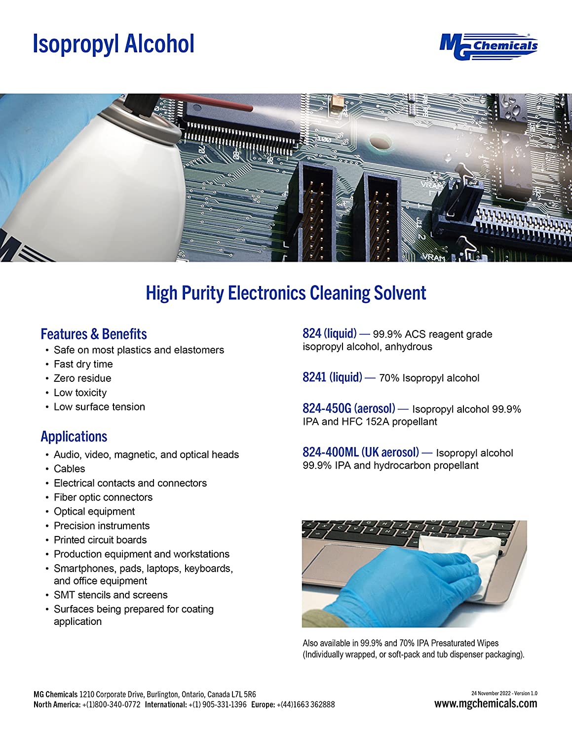 This is 99.9% ACS reagent grade isopropyl alcohol for cleaning electronics. It is a flammable clear solvent that effectively cleans ionic, polar and non-polar residues. It is safe on most painted surfaces, plastics, and elastomers. It leaves no residue, evaporates quickly relative to water, and does not cause corrosion. It is low toxicity compared to alternative solvents and is similarly relatively environmentally benign, being ozone safe with excellent “green solvent” scores.