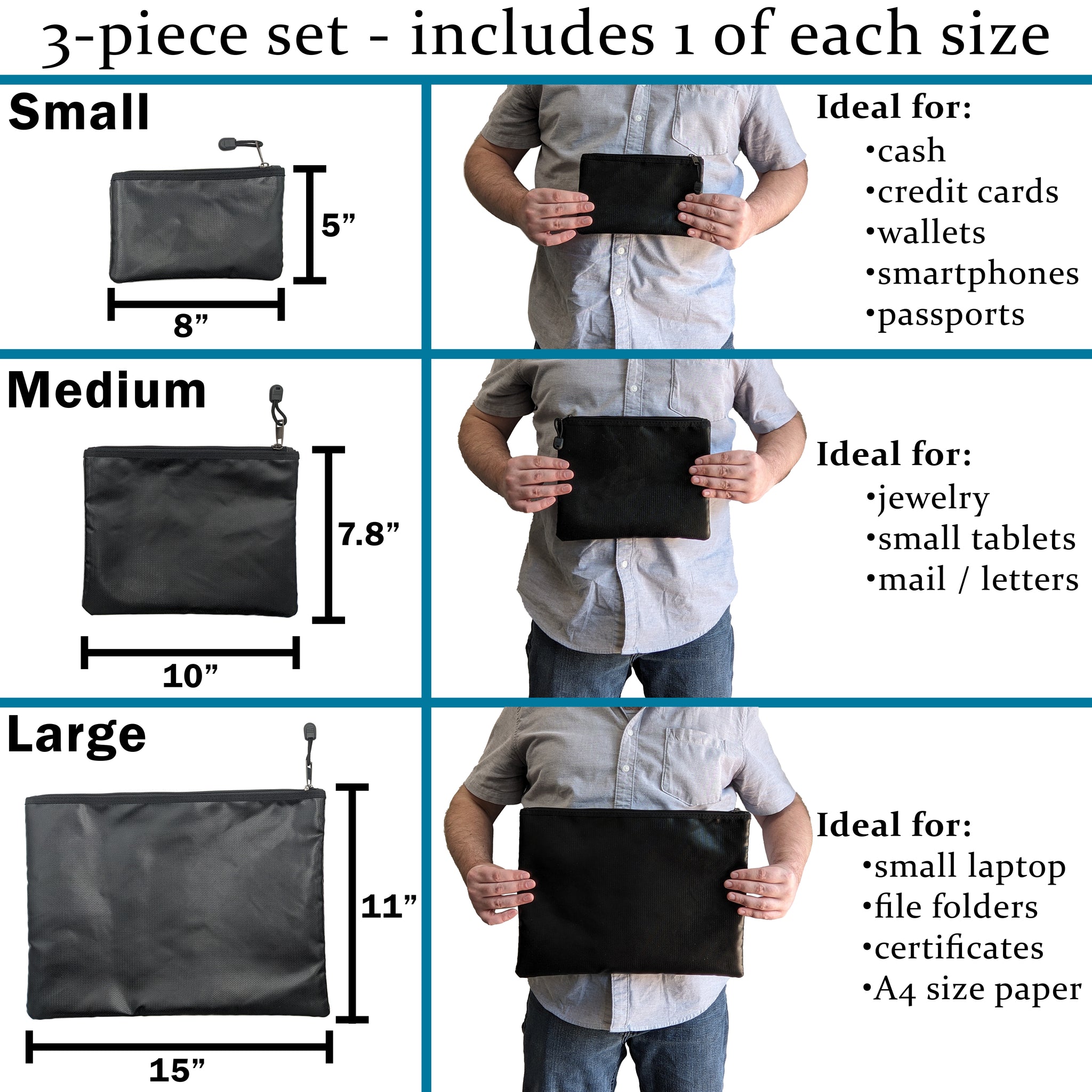 - SET OF 3 FIREPROOF ZIPPER BAGS - includes size Large 15"x11", Medium 10"x7.8", and Small 8"x5" for holding valuables, important documents, cash, and other items that you may need to protect from an unexpected fire