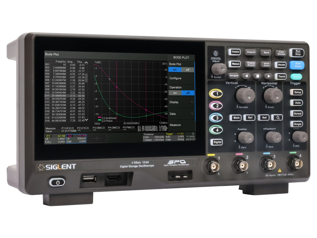 The SDS800X HD series employs Siglent’s SPO technology with a maximum waveform capture rate of up to 120,000 wfm/ s (normal mode, up to 500,000 wfm/s in Sequence mode), 256-level intensity grading display function plus a color temperature display mode. It also employs an innovative digital trigger system with high sensitivity and low jitter. The trigger system supports multiple powerful triggering modes including serial bus triggering. Tools such as History waveform recording, Search and Navigate functions, Mask Test, Bode Plot, Power Analysis and allow for extended waveform records to be captured, stored, and analyzed. An impressive array of measurement and math capabilities, options for a 25 MHz arbitrary waveform generator, as well as serial decoding are also features of the SDS800X HD.