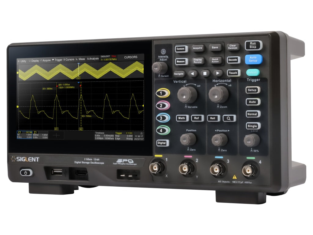 SIGLENT’s SDS800X HD series high resolution digital storage oscilloscopes are based on 2 GSa/s, 12-bit Analog-Digital Converters and front ends with excellent noise floor performance. They are available in bandwidths of 200 MHz, 100 MHz and 70 MHz, have maximum record length of 100 Mpts, and display 2/4 analog channels + 16 digital channels mixed signal analysis ability.