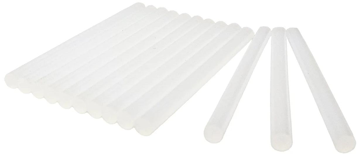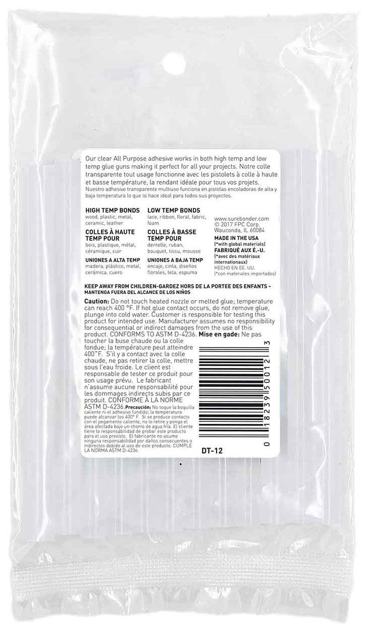 Surebonder DT-12 is a 12-pack of mini-size (5/16”, 0.27”) diameter by 4" long clear all-purpose glue sticks. These mini glue sticks work with all standard mini-size glue guns and will work for all-temperature (high, low, or dual temp) projects. Surebonder Clear Stik hot glue sticks dry clear to cloudy white in about 45 to 60 seconds. These glue sticks are perfect for everyday crafts, DIY projects, or household repairs. This product is proudly manufactured, quality tested, and packaged in Wauconda, Illinois, USA - with domestic and globally sourced materials. These hot glue sticks are non-toxic and conforms to ASTM D-4236.